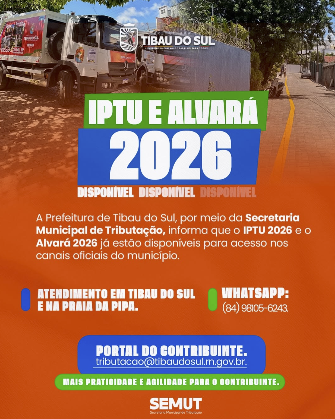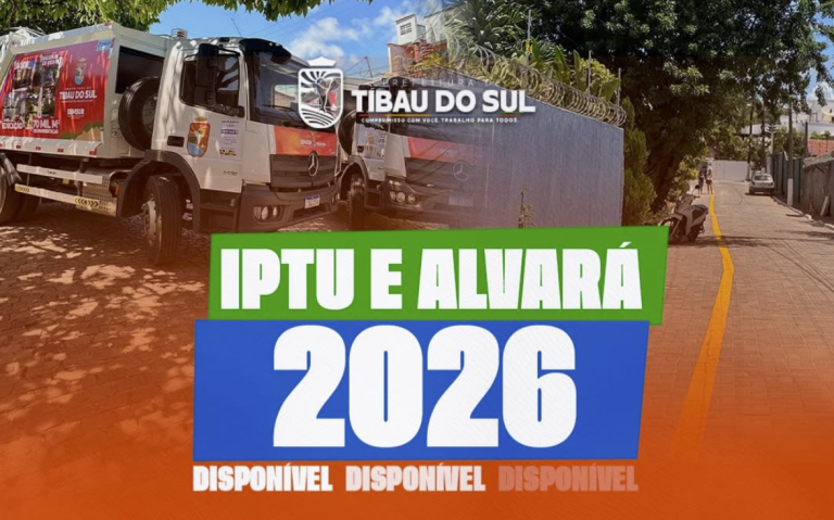A Prefeitura de Tibau do Sul, por meio da Secretaria Municipal de Tributação, informa que o IPTU 2026 e o Alvará 2026 já estão disponíveis para consulta e emissão pelos contribuintes do município.
